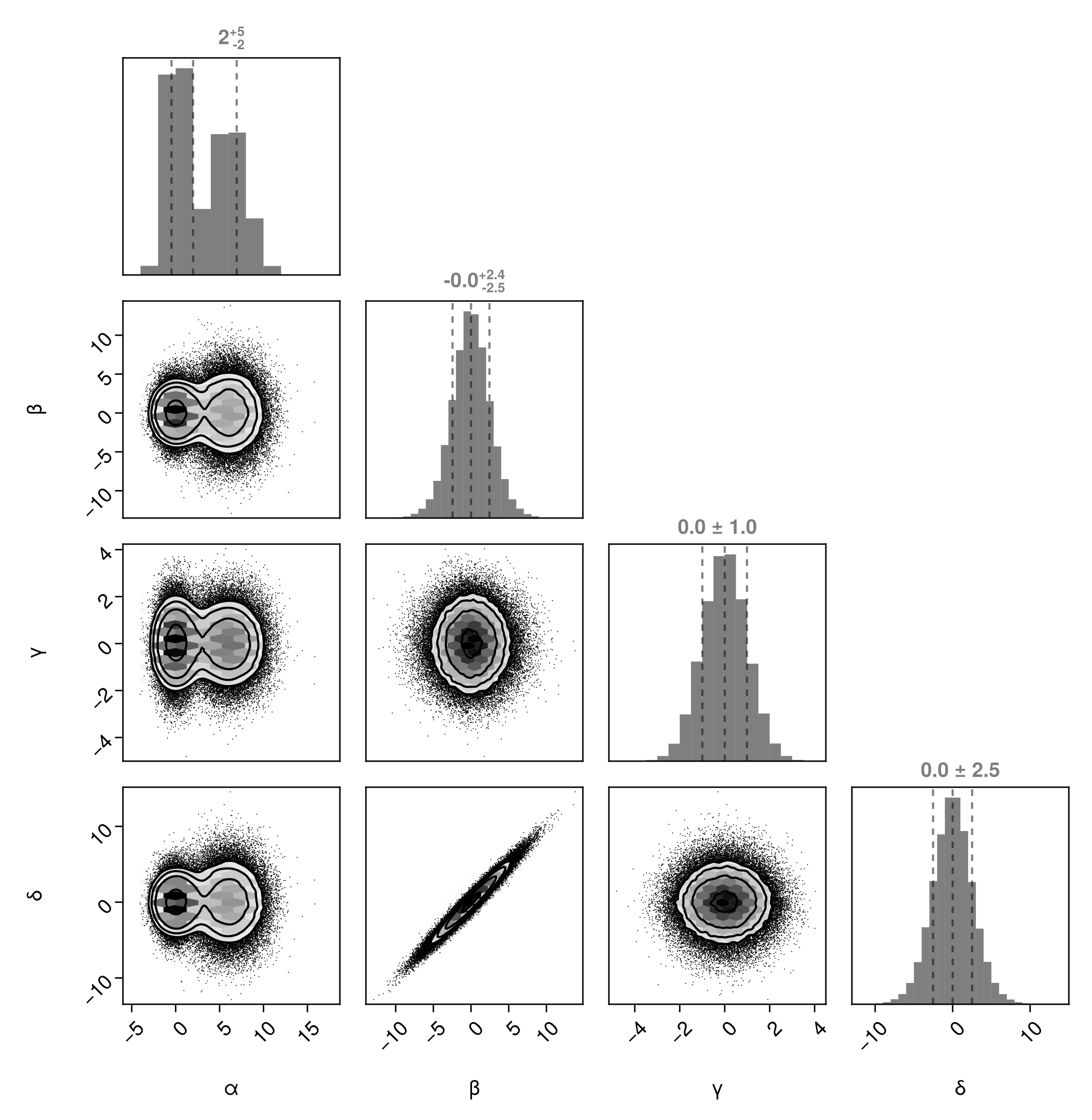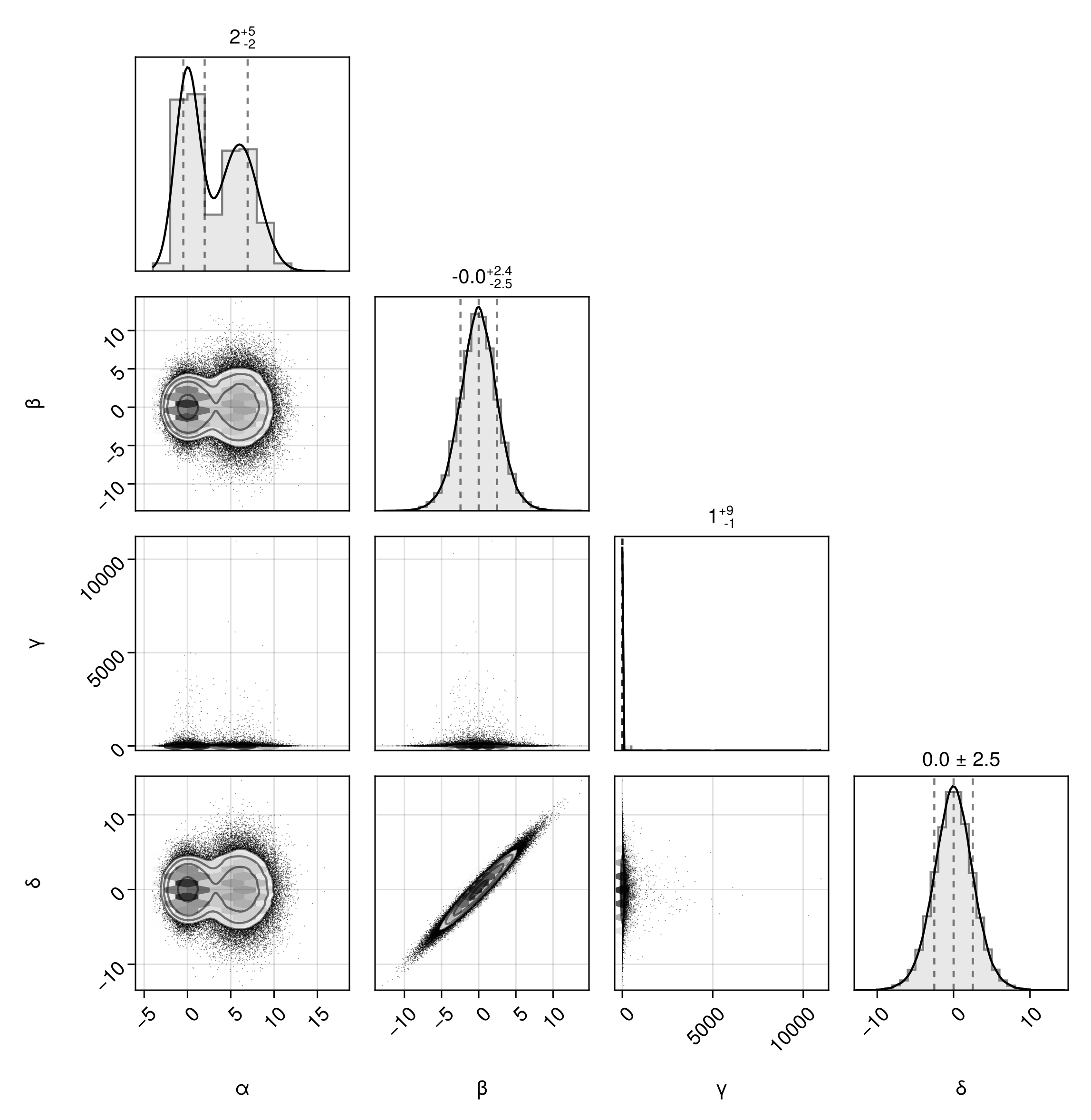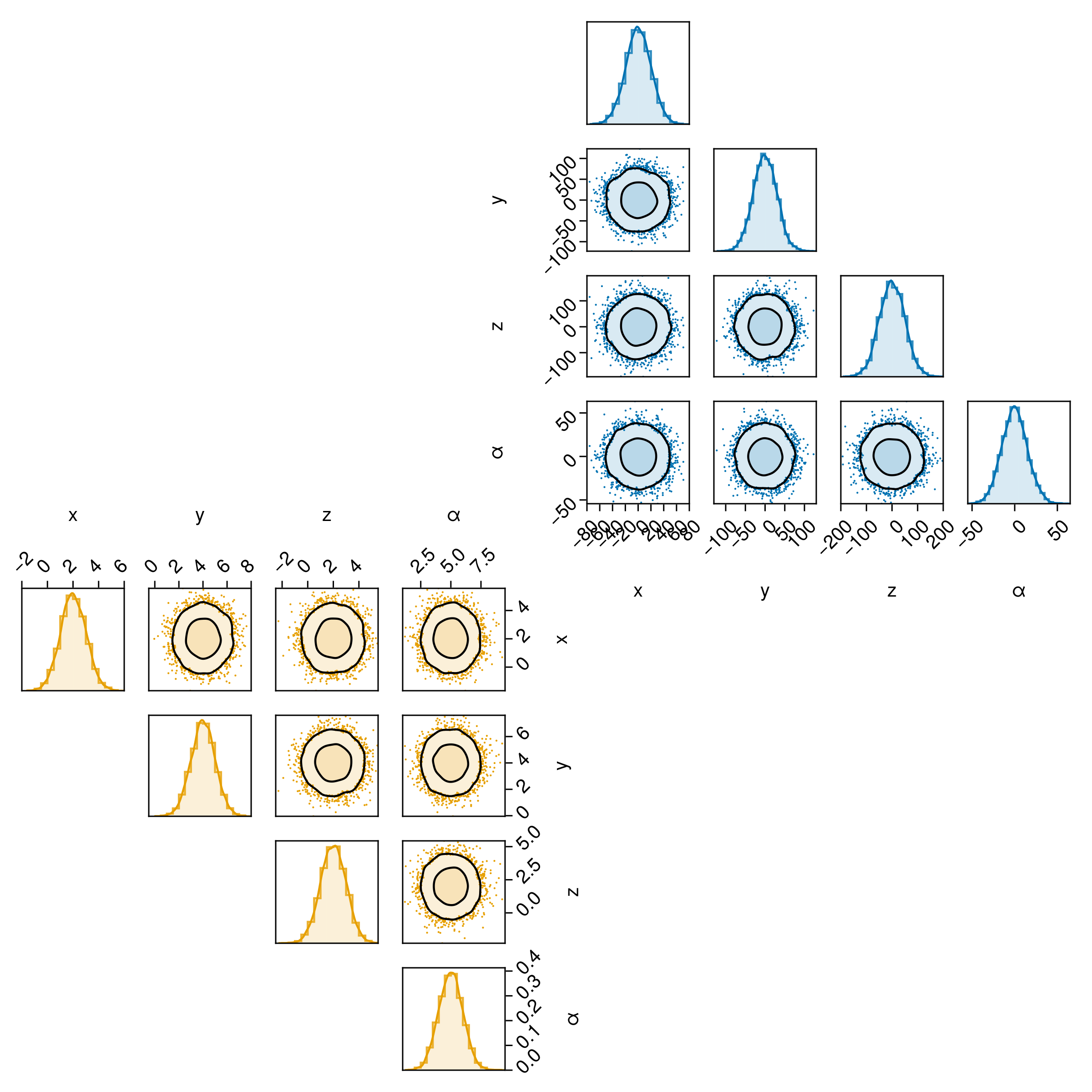 df => (PairPlots.Scatter(filtersigma=2), PairPlots.Contour())
