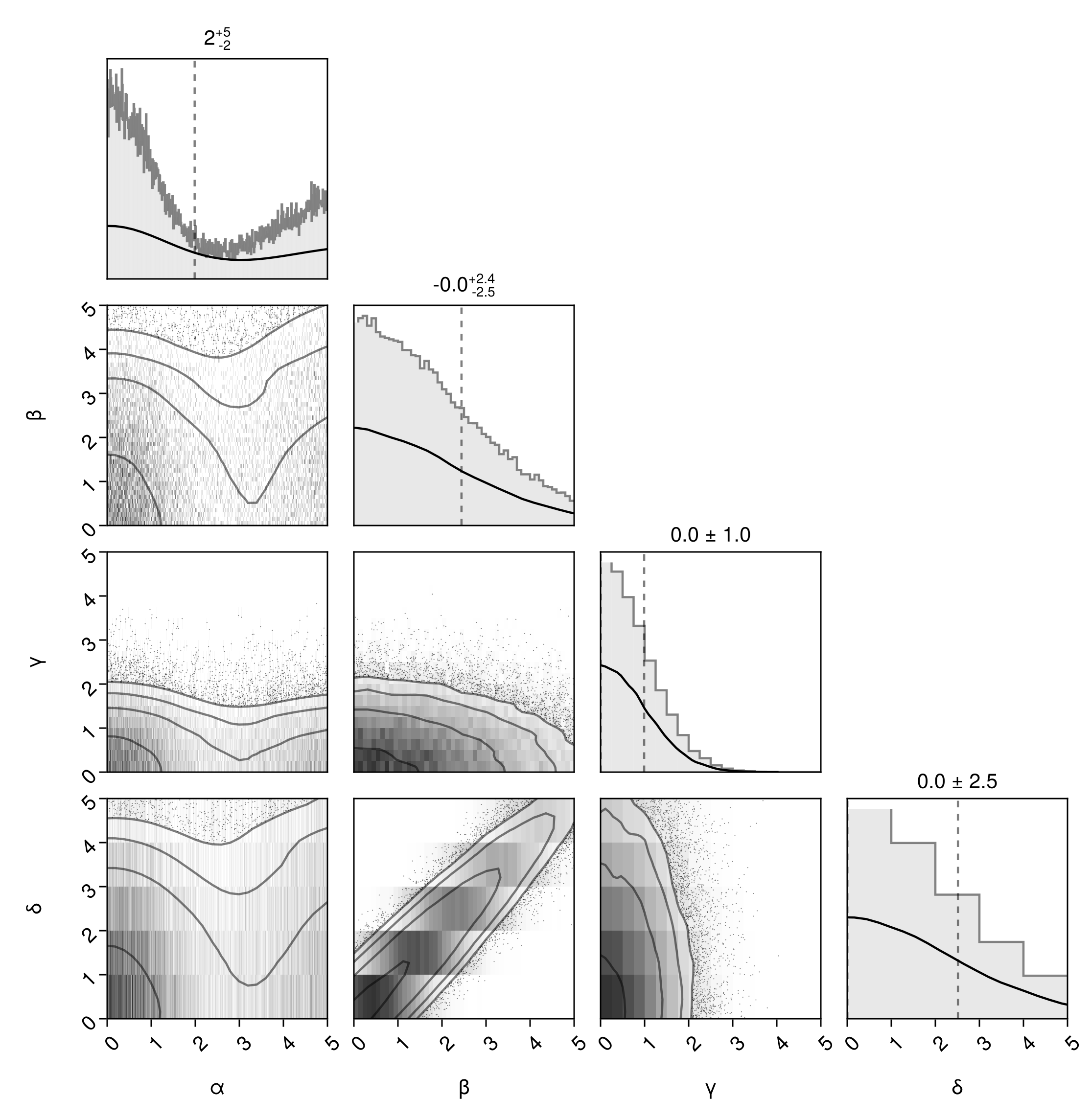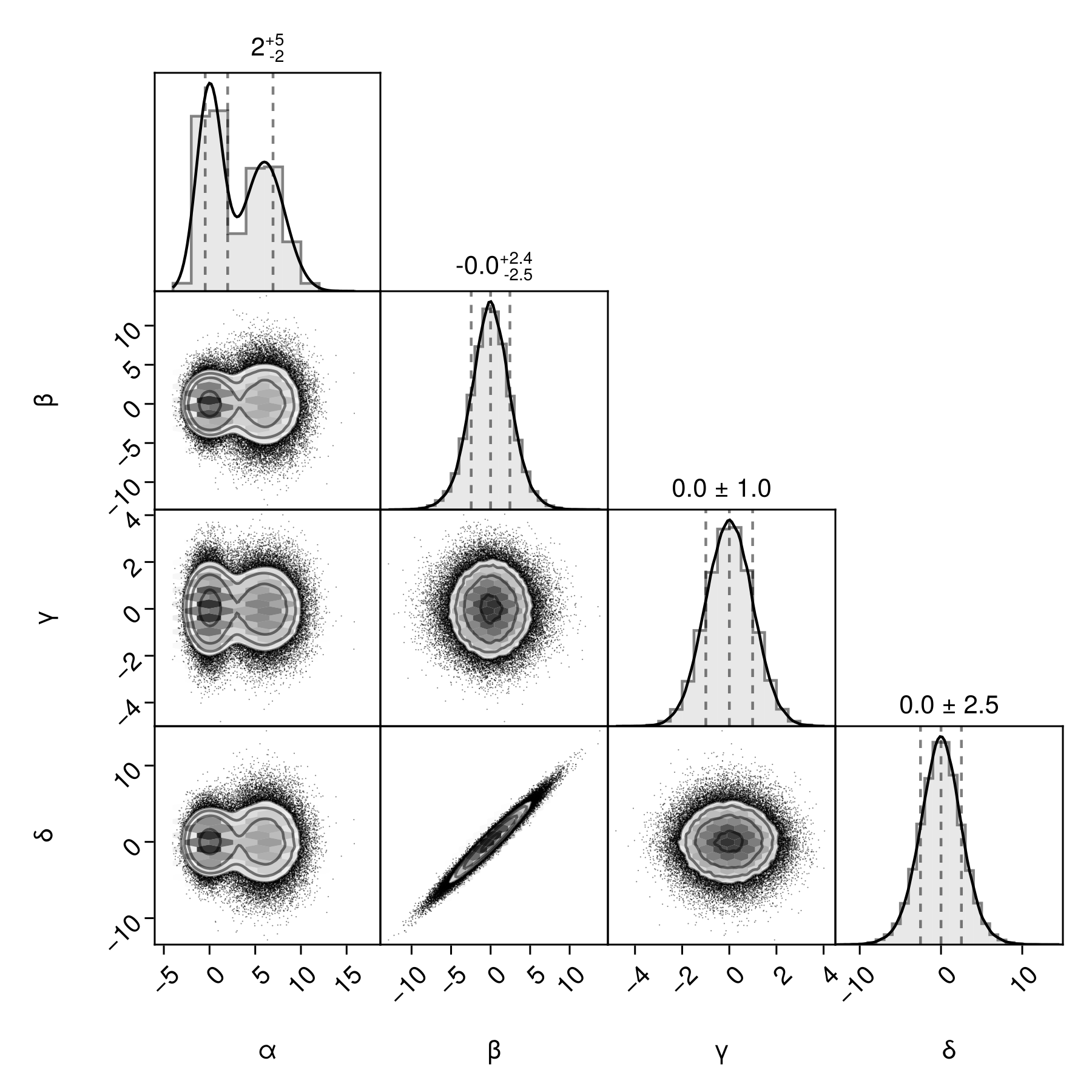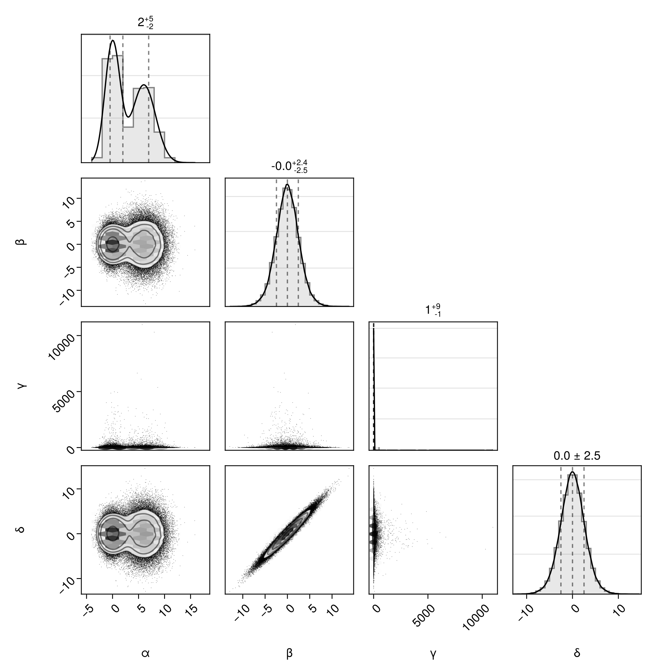 df => (PairPlots.Scatter(filtersigma=2), PairPlots.Contour())