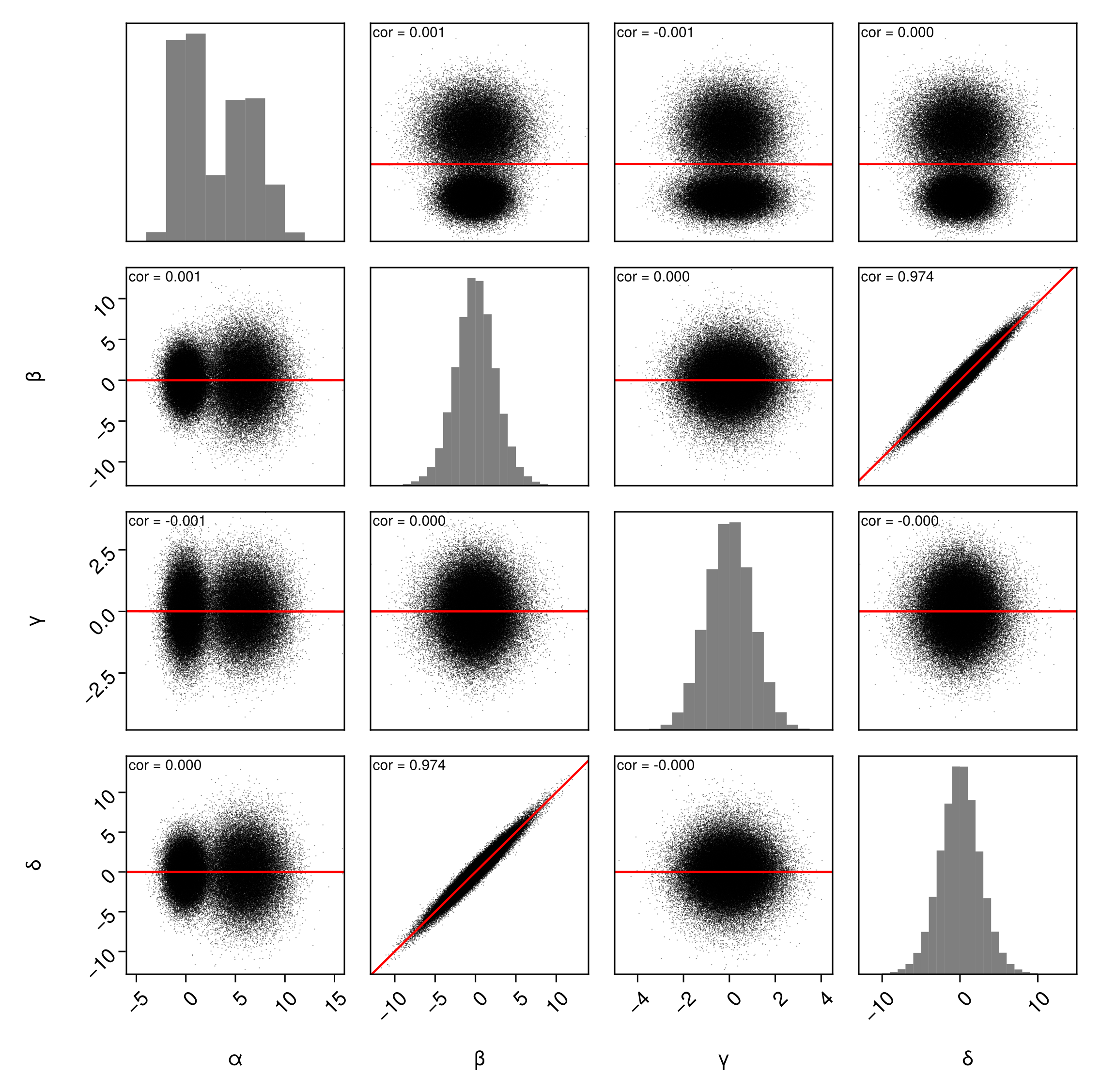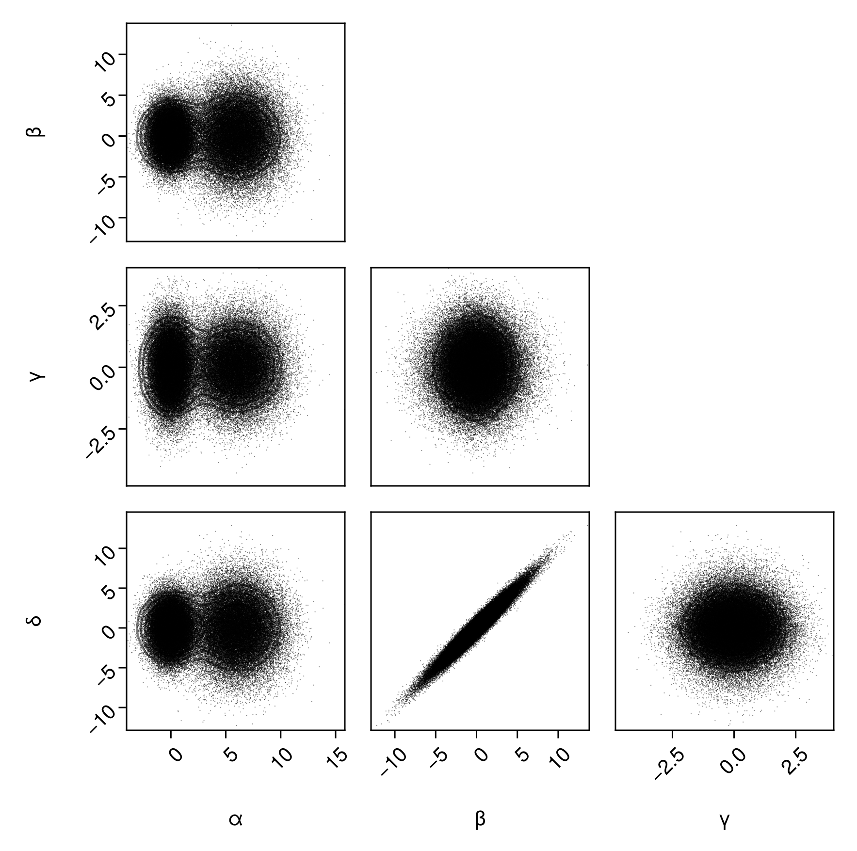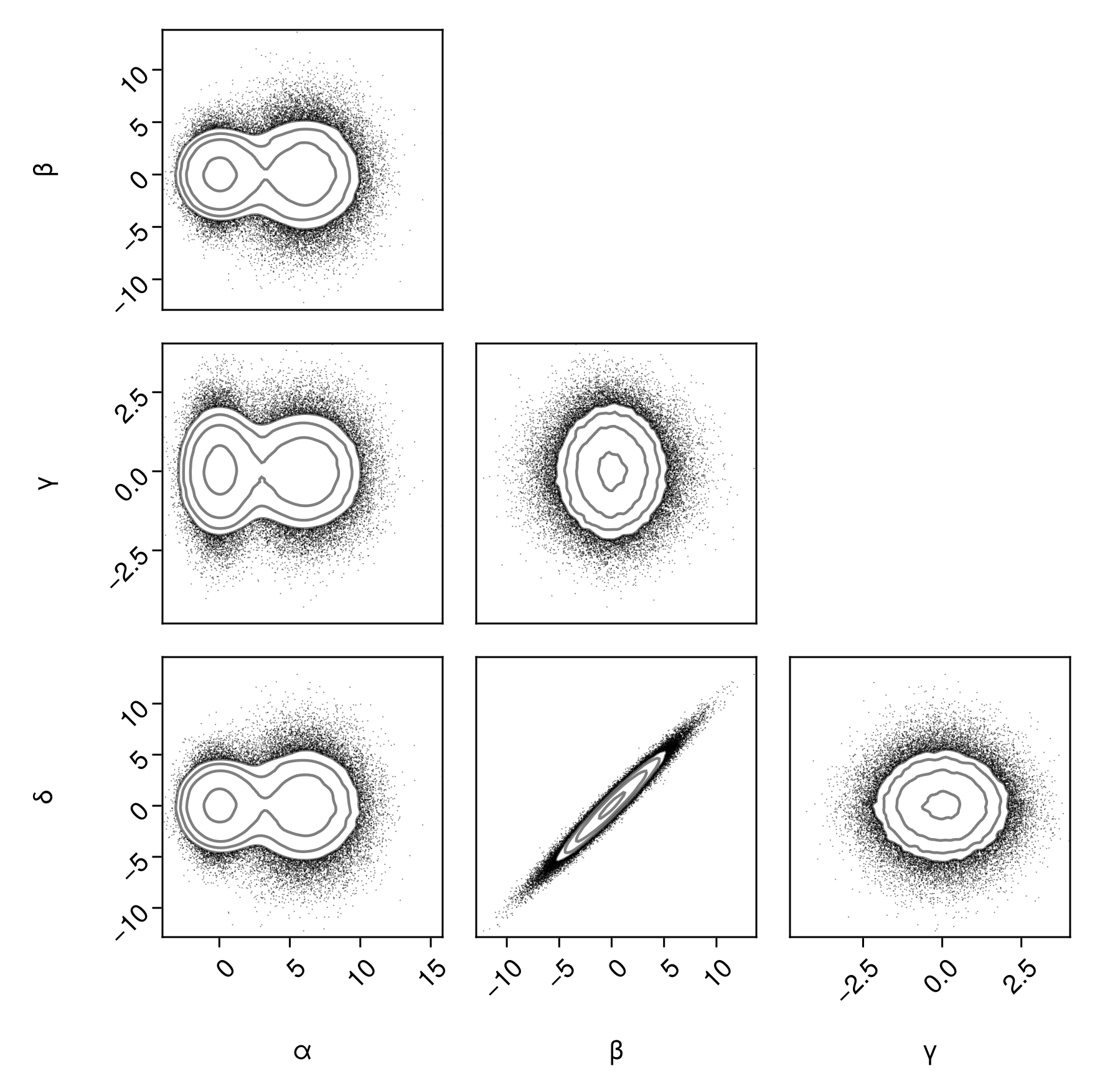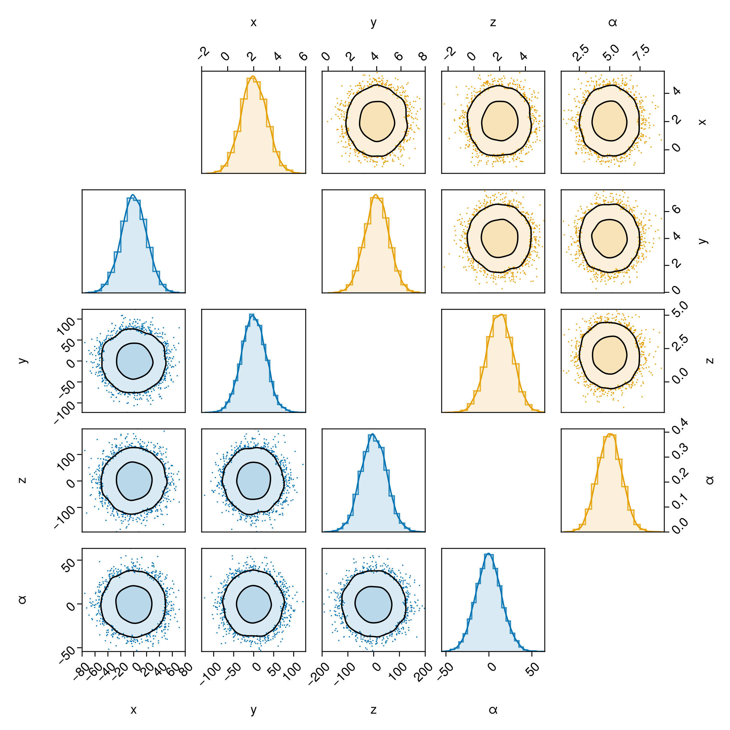 df => (PairPlots.Scatter(), PairPlots.Contour())