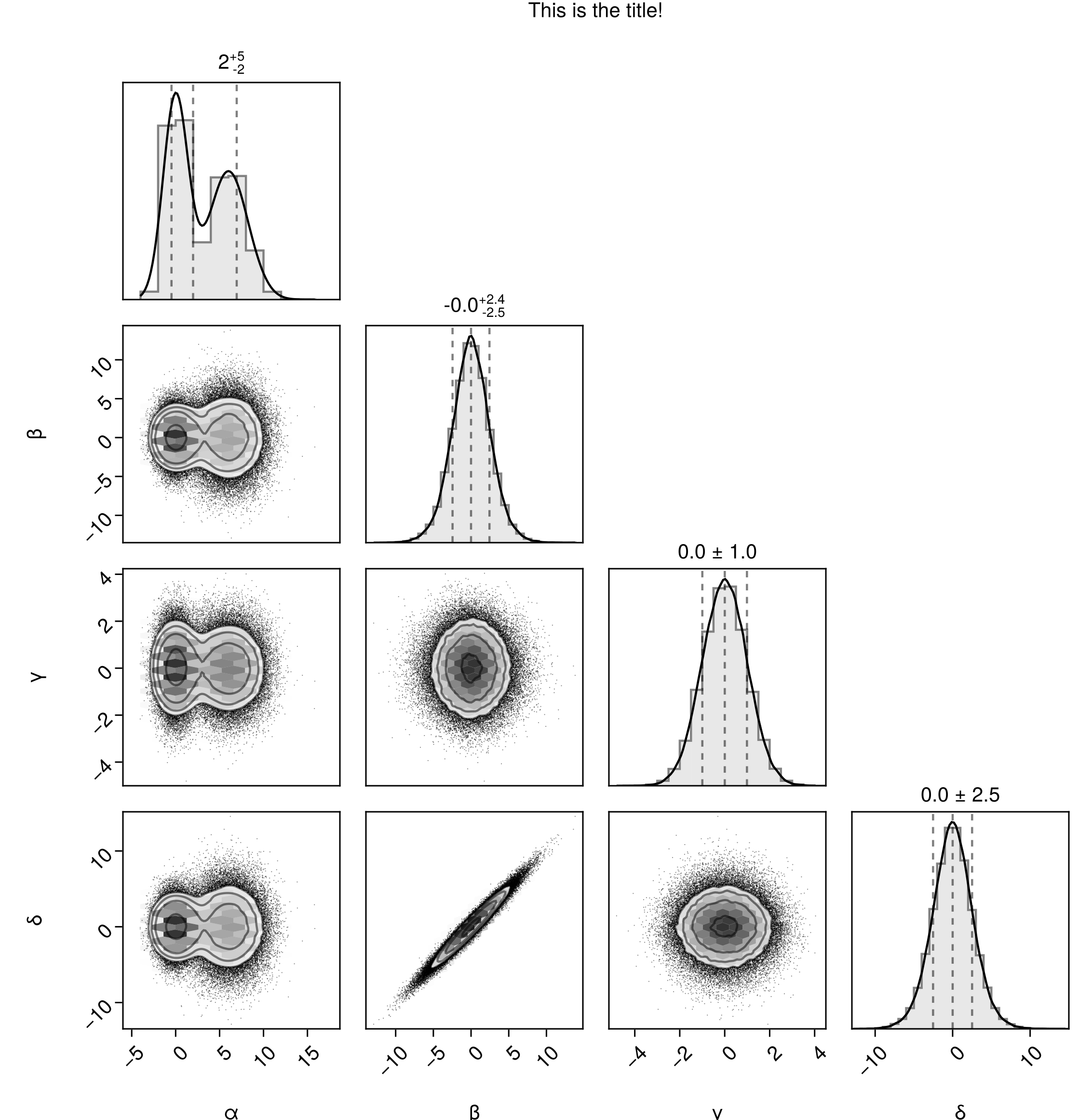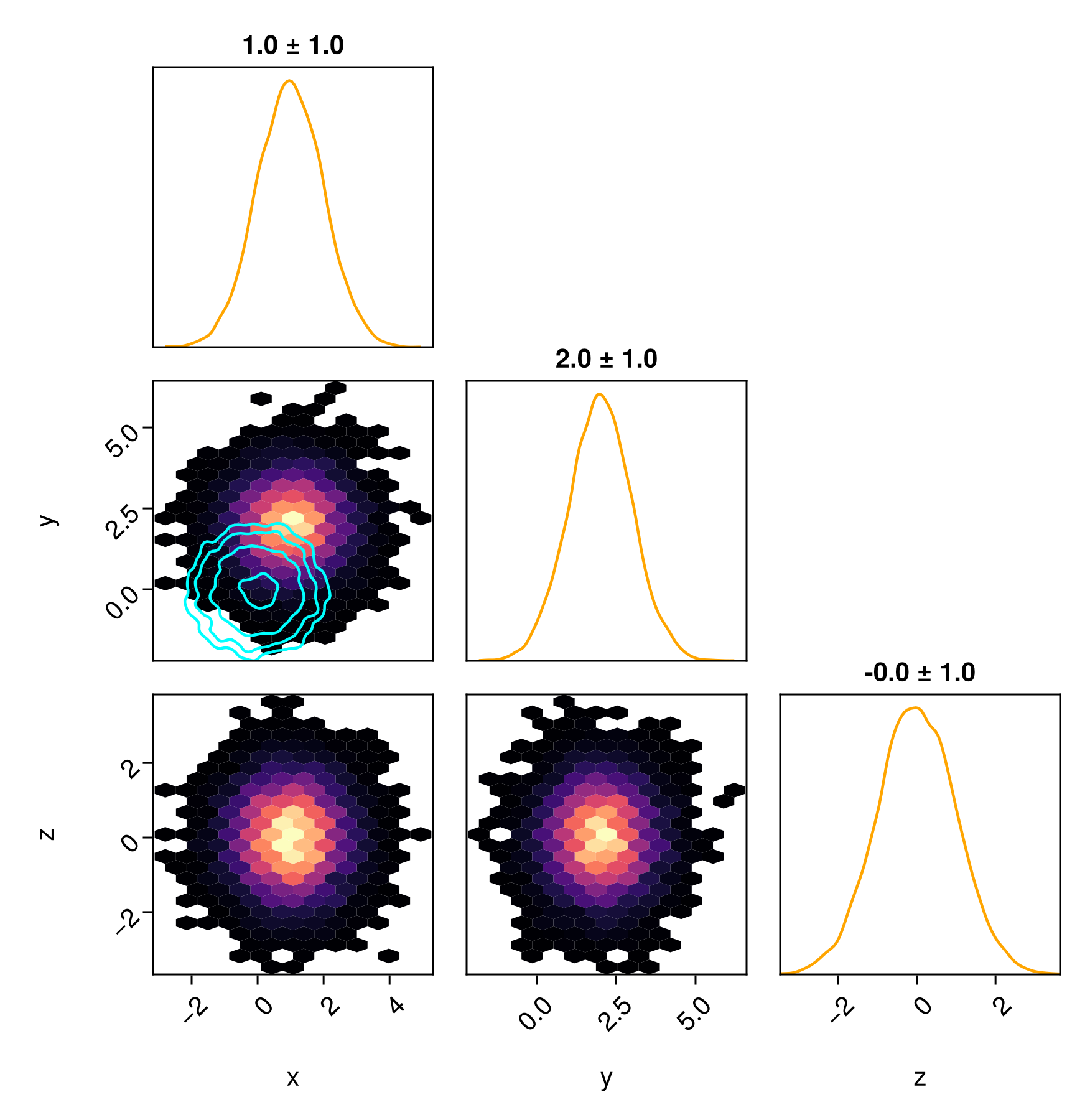 table2 => (PairPlots.HexBin(colormap=:magma), PairPlots.MarginDensity(color=:orange), PairPlots.MarginQuantileText(color=:black)),