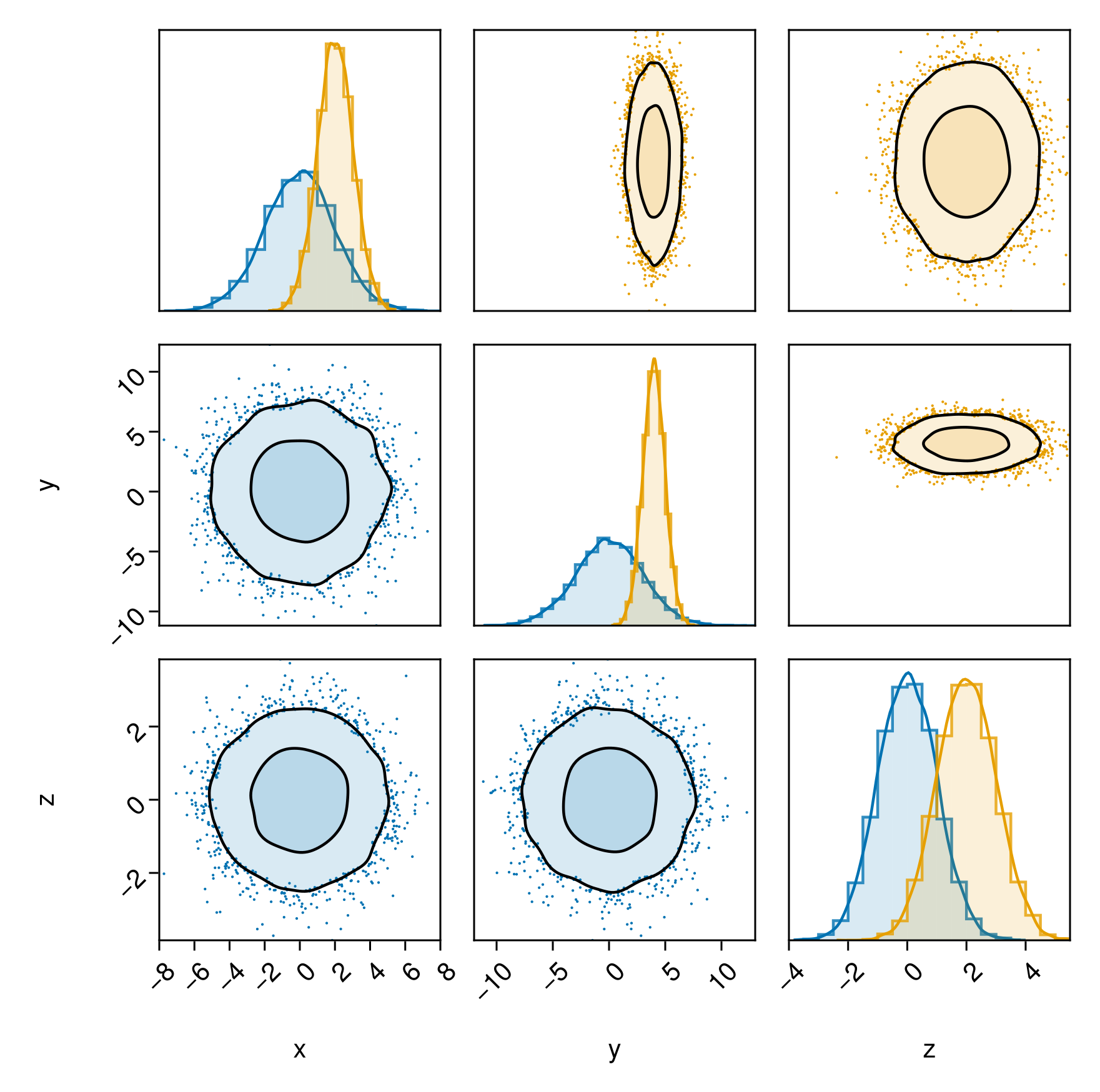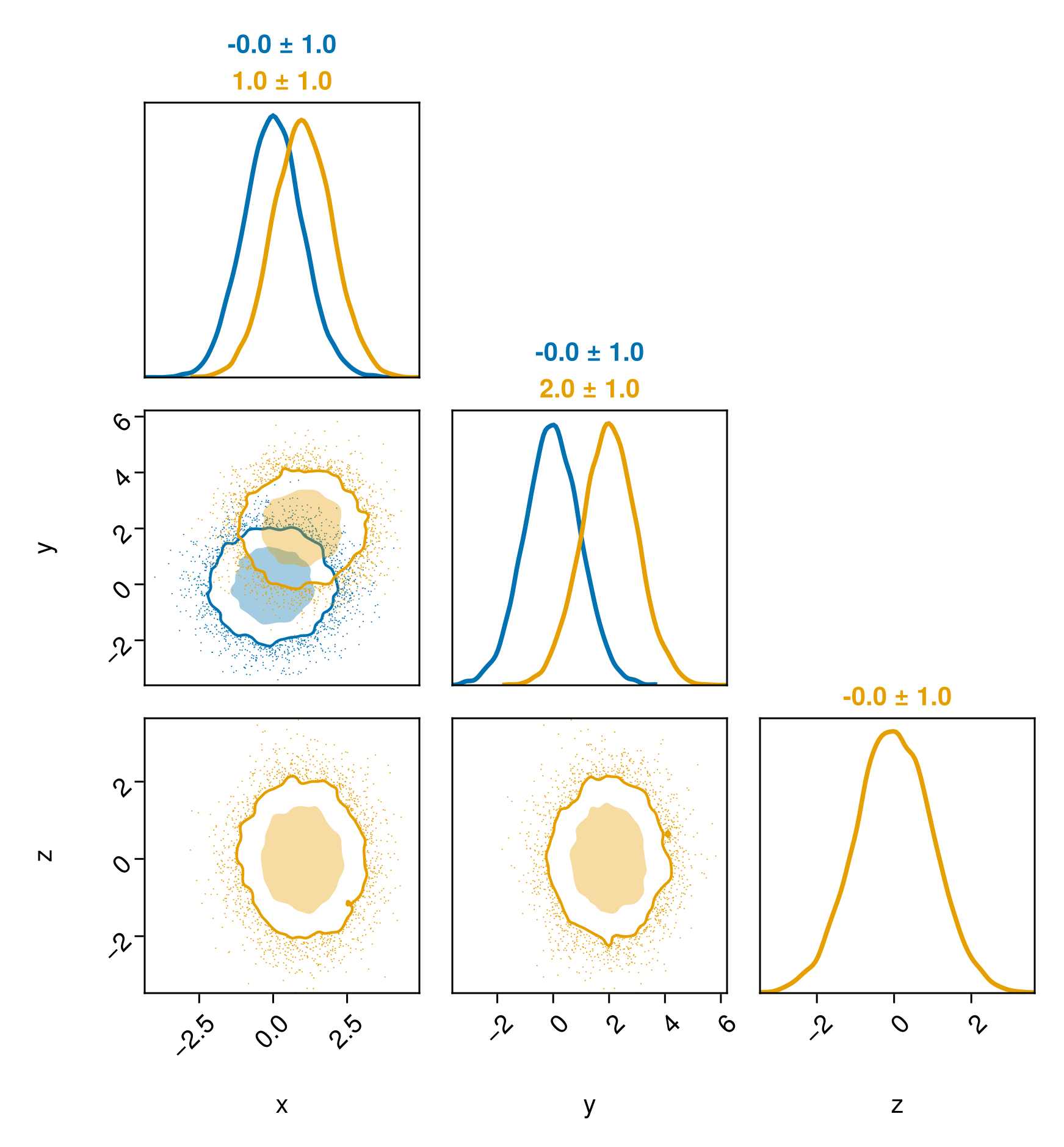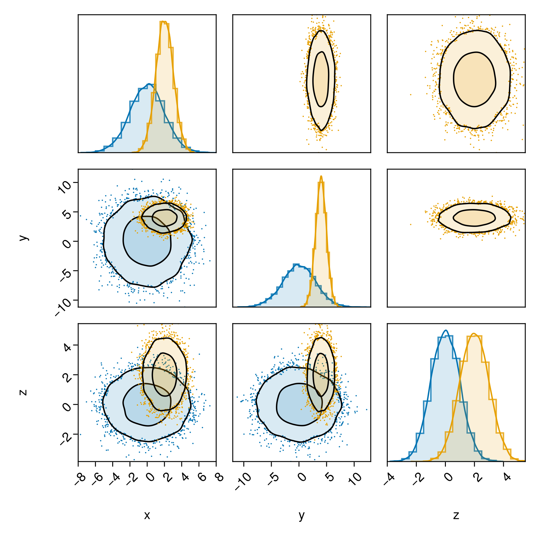 PairPlots.Contourf(strokewidth=1.5,color=(c2,0.15), bandwidth=2, sigmas=[1,3]),